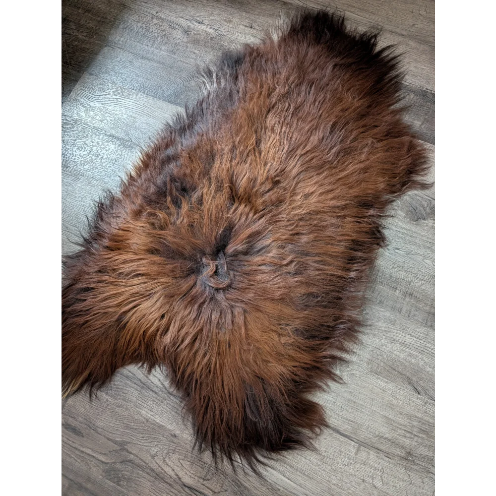 Get ready to experience the luxurious feel of our Icelandic sheepskin rugs, each one boasting varying lengths of lovely, natural wool. You'll find these sheepskins range in length from 40" to 43" with varying widths, making them a versatile addition to any room. These are dark rusty Icelandics, and can be multiple shades of very dark red brown with black contrast.