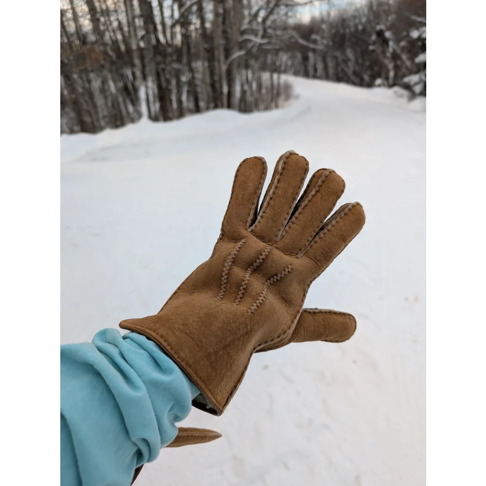 Great gloves made from sheepskin, one side leather and one side sheep's wool. Comfortable fit, it's the perfect thickness to still freely more your fingers but with the added protection and warmth of the sheep's wool.