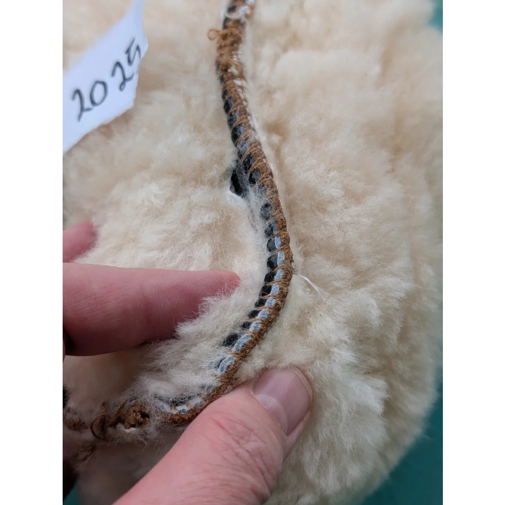 Voici un petit aperçu de cette offre spéciale : pendant la production, la façon dont les semelles ont été cousues à la pantoufle principale en peau de mouton a créé une arête interne légèrement plus ferme. Alors qu'à l'origine, une couche de peau de mouton lainée était cousue par-dessus pour amortir les chocs, ce lot présente une couche de laine moins proéminente dans cette zone spécifique. (Tu peux te référer à la photo détaillée de l'annonce pour voir les coutures intérieures qui forment cette arête).