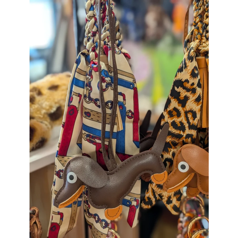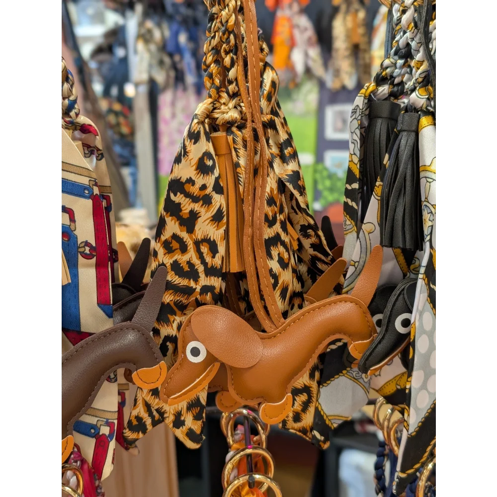 Brown dachshund, tassel and leopard printed scarf BAG CHARM