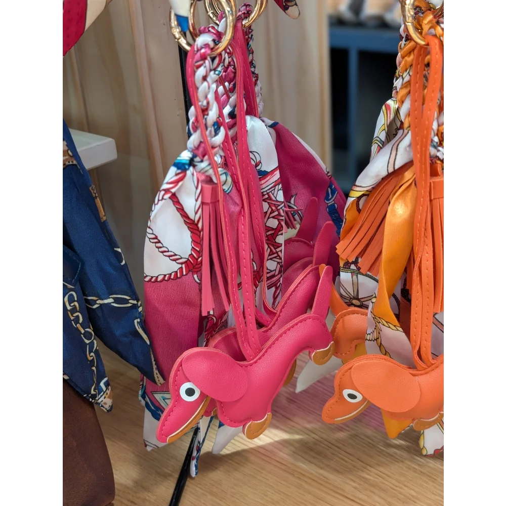 Orange dachshund, tassel and printed scarf BAG CHARM