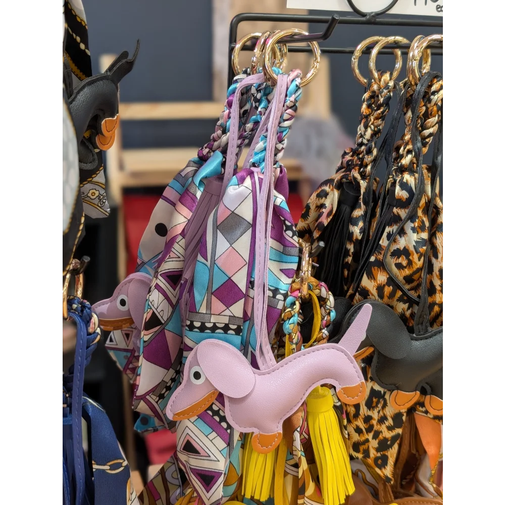 Dark pink dachshund, tassel and printed scarf BAG CHARM